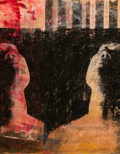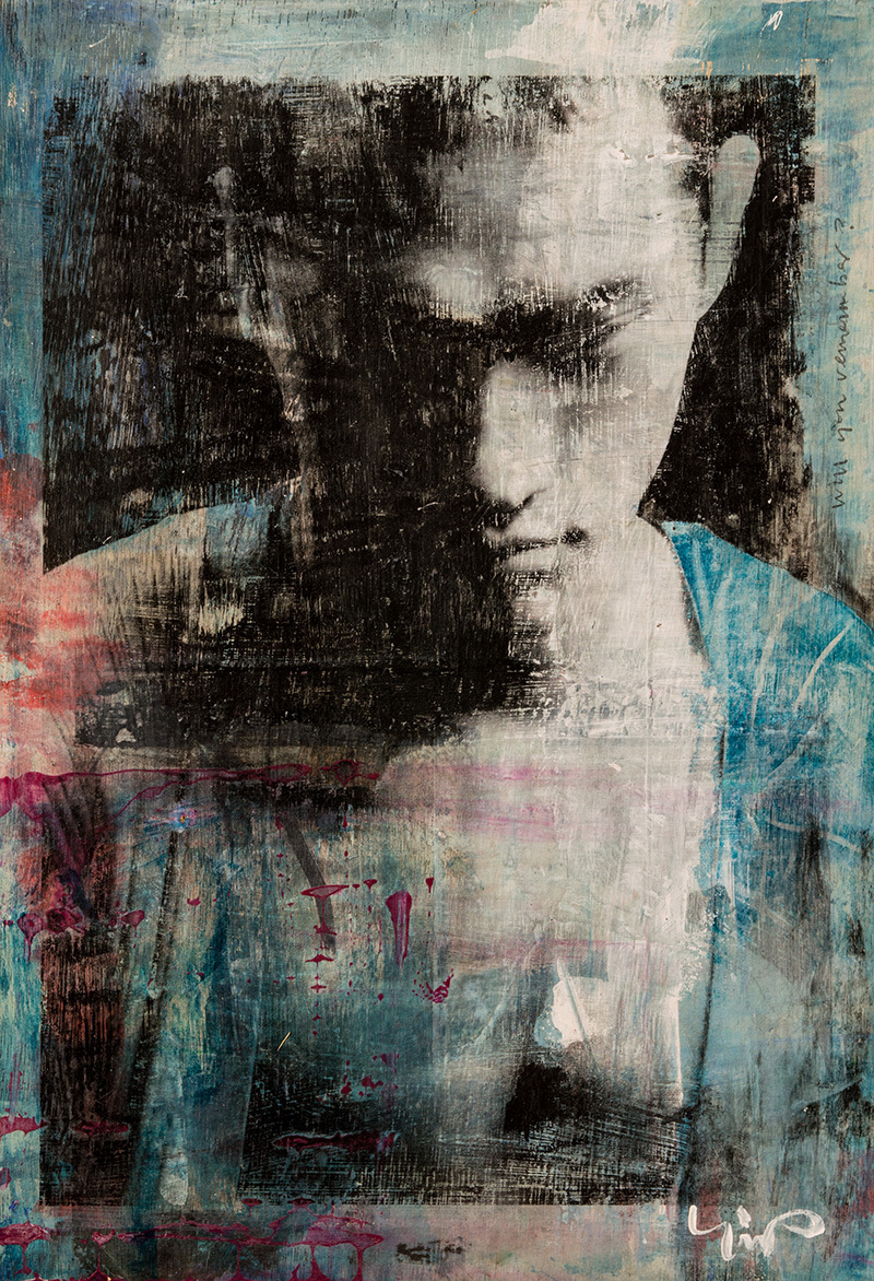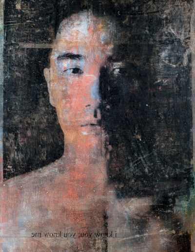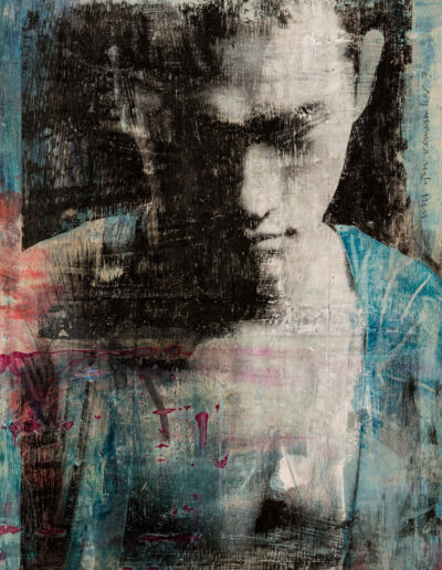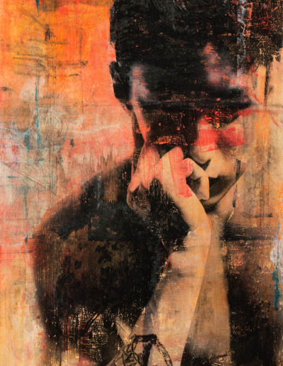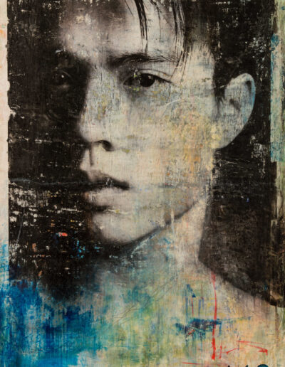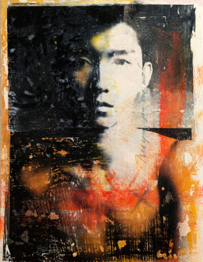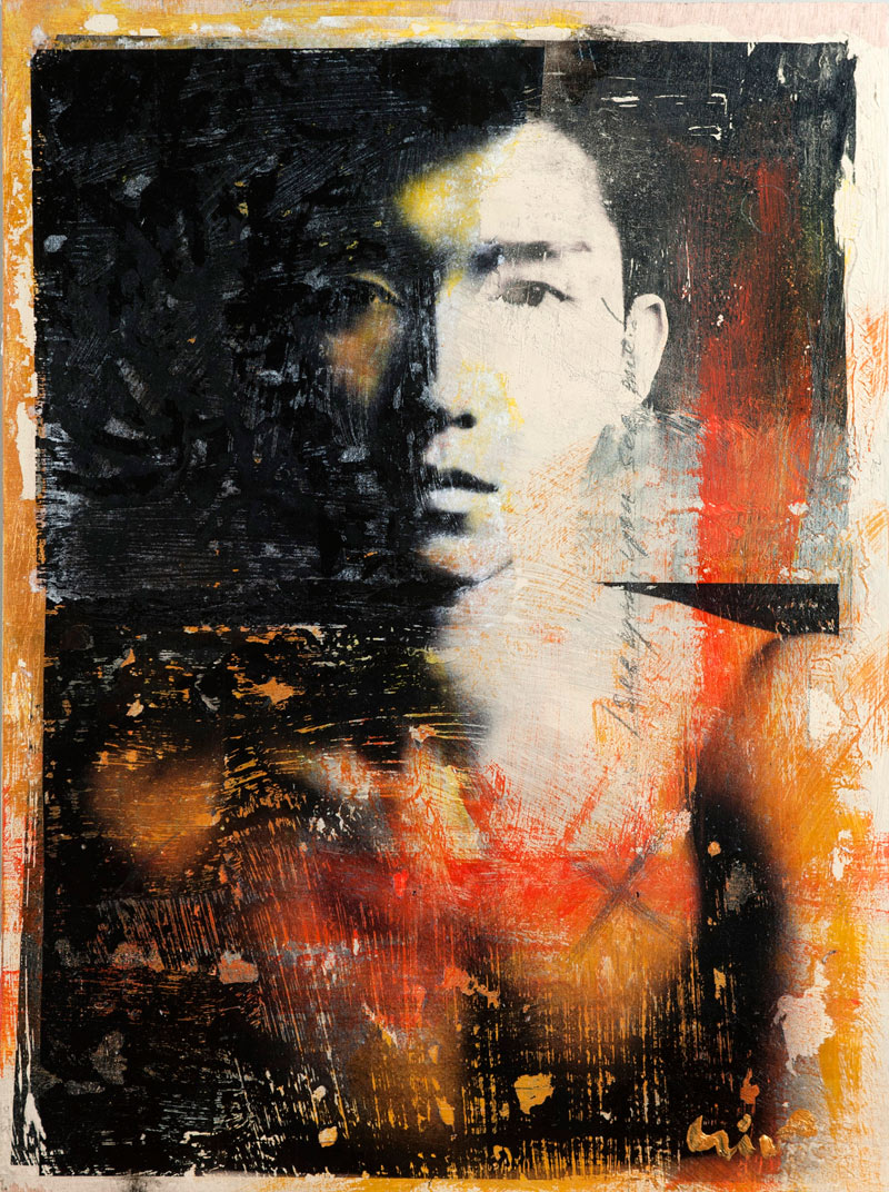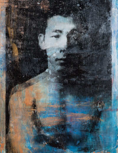 In my work while creating the animals in the Seven Sacred Sins series, I felt that the medium of image transfer could be also be used in creating strong portraits of some of the Asian men I had photographed. As it was, I was right. The mysterious qualities distressed medium lent itself well to portraits, and in some cases of the human body. The pieces are all painted and transferred onto plywood, reminding me of an era of woodcutting as precious as the self portraits by Albrecht Dürer, but by no means as accomplished nor refined.